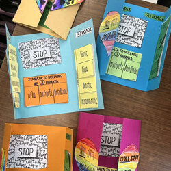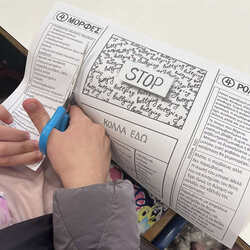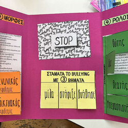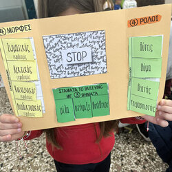 Στη συνέχεια, οι μαθητές και οι μαθήτριες δημιούργησαν ατομικές κατασκευές, με τις οποίες ενημερώθηκαν για τις μορφές του σχολικού εκφοβισμού, τους ρόλους που εμφανίζονται σε μια τέτοια κατάσταση (θύτης, θύμα, θεατής, υπερασπιστής), καθώς και τους πρακτικούς τρόπους αντίδρασης (π.χ. να ζητούν βοήθεια από έναν ενήλικα, να υποστηρίζουν το παιδί που δέχεται εκφοβισμό και να λένε ξεκάθαρα «στοπ» σε τέτοιες συμπεριφορές). Στις κατασκευές αποτύπωσαν το μήνυμα «Ναι στη φιλία – Όχι στη βία», εκφράζοντας με χρώματα και δημιουργικότητα τη σημασία της αποδοχής και της συνεργασίας.
