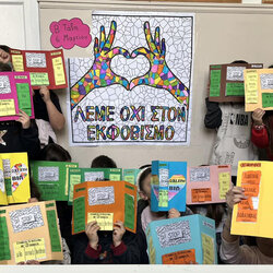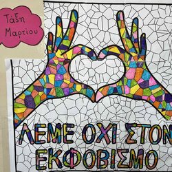 Τέλος, εργάστηκαν ομαδικά και αποτελεσματικά για τη δημιουργία μιας μεγάλης αφίσας (κολλάζ) με το σύνθημα «Λέμε όχι στον εκφοβισμό», στέλνοντας ένα δυνατό και αισιόδοξο μήνυμα ενότητας, σεβασμού, αποδοχής και φιλίας, το οποίο θα ευαισθητοποιεί και θα θυμίζει επιθυμητές συμπεριφορές σε όλη τη διάρκεια της σχολικής χρονιάς!
