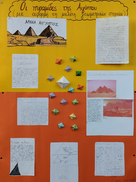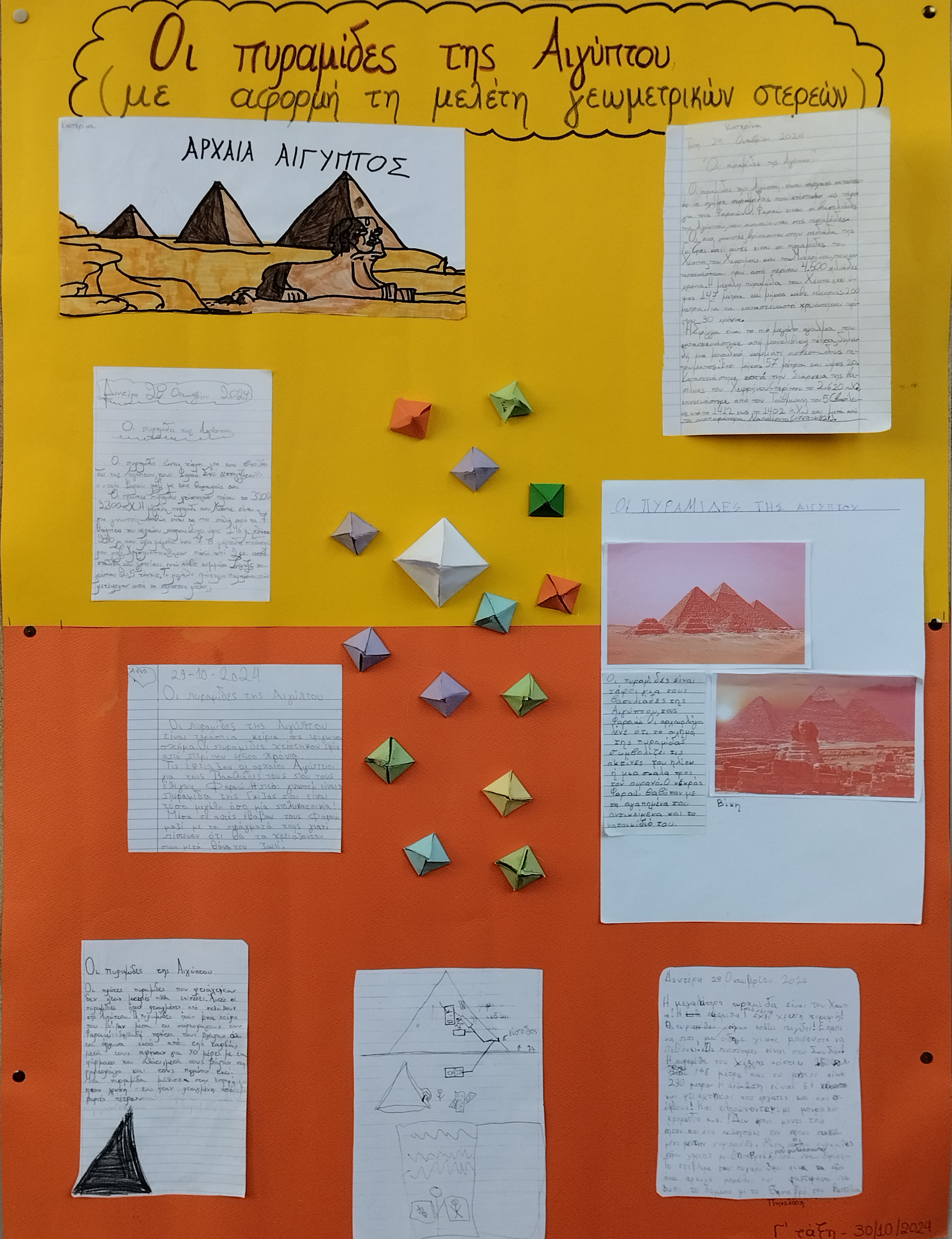 Η συλλογική μας προσπάθεια ολοκληρώθηκε με τη δημιουργία μιας μεγάλης αφίσας, όπου συνδυάσαμε τις πληροφορίες και τις καλλιτεχνικές δημιουργίες των μαθητών. Την εμπλουτίσαμε με πυραμίδες κατασκευασμένες από αναπτύγματα, ενισχύοντας έτσι τη σύνδεση της θεωρίας με την πράξη. Η αφίσα αναρτήθηκε σε έναν από τους πίνακες του διαδρόμου του σχολείου, κάνοντας την προσπάθεια των μαθητών/τριών ορατή σε όλη τη σχολική κοινότητα. Μέσα από αυτή τη δραστηριότητα, το μάθημα ξεπέρασε τα όρια της τάξης, ενθαρρύνοντας τα παιδιά να ανακαλύψουν, να δημιουργήσουν και να μοιραστούν τις γνώσεις τους.