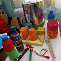 Τα παιδιά κατασκεύασαν, κρόταλα, σείστρα, μαράκες, τύμπανα και όργανα δικής τους έμπνευσης, τα χρωμάτισαν με τέμπερες και τα διακόσμησαν με φαντασία. Στη συνέχεια σε ομάδες αφηγήθηκαν μια ιστορία με ήχους με τα μουσικά τους όργανα.