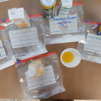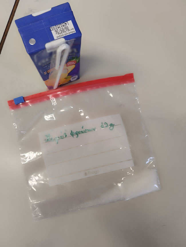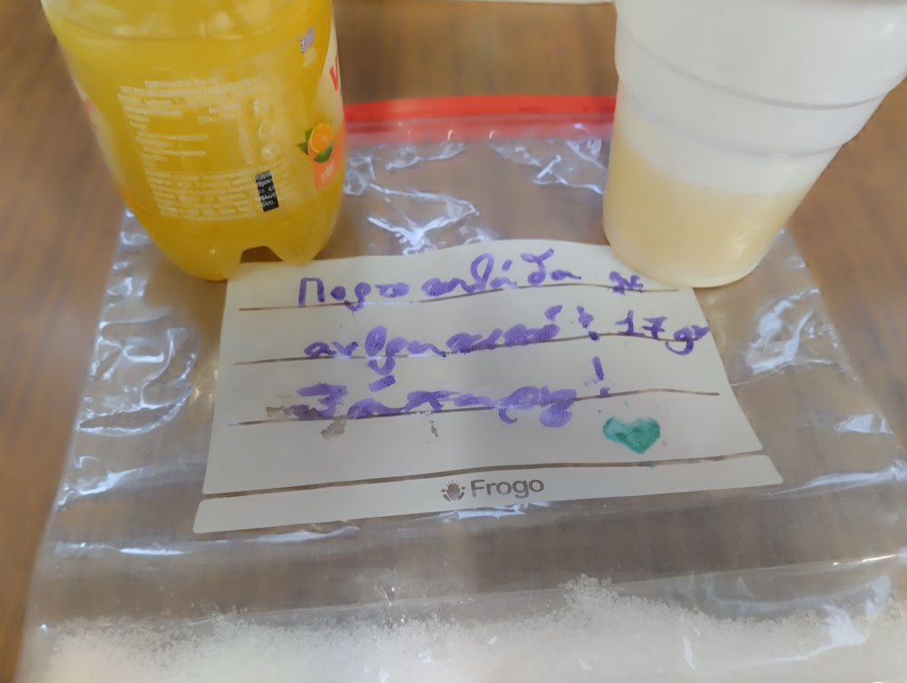 Στον όμιλο διατροφής «Εργαστήριο υγιεινής διατροφής: ερευνώ κι ανακαλύπτω τη μαγεία της τροφής» ασχοληθήκαμε με τις ετικέτες των τροφίμων και τις πληροφορίες που μας δίνουν. Ειδικότερα, συζητήσαμε για τους υδατάνθρακες και τα σάκχαρα. Συζητήσαμε για τα είδη των σακχάρων που μπορεί να περιέχουν τα τρόφιμα, για τις παγίδες που μπορεί να κρύβει η δήλωση «χωρίς ζάχαρη» κι επιπλέον κάναμε ένα μικρό πείραμα. Παρατηρήσαμε τις ετικέτες διατροφικής αξίας συσκευασμένων φυσικών χυμών, φρουτοποτών, νέκταρ και αναψυκτικών και συγκρίναμε την περιεκτικότητά τους σε σάκχαρα. Για το κάθε ποτό γεμίσαμε σακουλάκια με ζάχαρη που η μάζα της αντιστοιχούσε στη μάζα των σακχάρων που περιέχονταν σε 100ml ποτού. Το πείραμα, το επαναλάβαμε στην τάξη (Δ’ τάξη, 2025-2026), στο μάθημα του Εργαστηρίου Δεξιοτήτων στο εργαστήριο «Επιλέγω υγιεινές συμπεριφορές για να ζω καλύτερα».