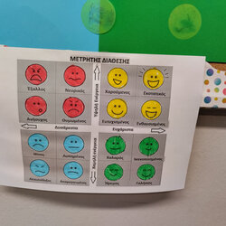 Η ημέρα ξεκινά με χαιρετισμό, ανταλλαγή καλημέρας και σύντομη συζήτηση, όπου οι μαθητές/τριες μοιράζονται σκέψεις και συναισθήματα. Κατά την προσέλευση, αλλά και μέσα στη μέρα, ενθαρρύνονται να διατυπώνουν θετικές δηλώσεις μπροστά στον «καθρέφτη θετικών δηλώσεων», ενισχύοντας την αυτοπεποίθησή τους. Παράλληλα, γίνεται καταγραφή συναισθημάτων με τη χρήση «δείκτη διάθεσης» (mood meter): κάθε παιδί τοποθετεί σε χρωματιστό πίνακα το συναίσθημα που το εκφράζει, επιλέγοντας ανάμεσα σε τέσσερις ζώνες που αποτυπώνουν την ένταση και το πρόσημο του συναισθήματος. Έτσι διαμορφώνεται καθημερινά μια σαφής εικόνα για το κλίμα της τάξης και καλλιεργείται η αναγνώριση και η αποδοχή των συναισθημάτων.