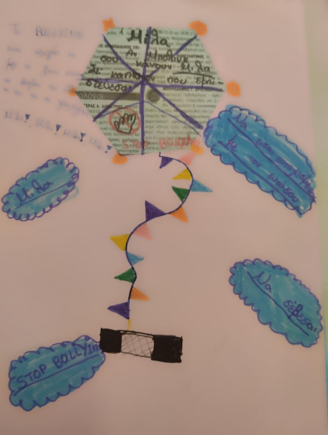 Στη συνέχεια πραγματοποιήσαμε μια μελέτη περίπτωσης, εστιάζοντας στις τρεις πλευρές ενός περιστατικού εκφοβισμού: του θύτη, του θύματος και των θεατών. Μέσα από τη συζήτηση καταλήξαμε στο συμπέρασμα ότι είναι σημαντικό να μιλάμε για τα περιστατικά βίας που συμβαίνουν γύρω μας, ακόμη κι όταν είμαστε απλοί θεατές. Με σύνθημα «Μίλα», δημιουργήσαμε χαρταετούς από χαρτί, πάνω στους οποίους οι μαθητές και οι μαθήτριες έγραψαν μηνύματα ενθάρρυνσης προς πιθανά θύματα εκφοβισμού αλλά και προς όσους γίνονται μάρτυρες τέτοιων περιστατικών.