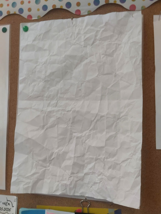 Οι δράσεις μας ολοκληρώθηκαν με τη δραστηριότητα «Το τσαλακωμένο χαρτί», μια συμβολική δραστηριότητα που μας διδάσκει πως τα άσχημα λόγια αφήνουν μέσα μας σημάδια, πληγές που δεν επουλώνονται πλήρως, ακόμη κι αν ζητήσουμε συγγνώμη ή αν αργότερα ακούσουμε όμορφα λόγια. Πήραμε λοιπόν ένα ατσαλάκωτο, καθαρό χαρτί και αρχίσαμε να του λέμε άσχημα λόγια, λόγια που πληγώνουν. Με κάθε άσχημο λόγο το τσαλακώναμε, μέχρι που έγινε μια μπάλα. Στη συνέχεια του ζητήσαμε συγγνώμη και αρχίσαμε να του λέμε λόγια που δίνουν χαρά: ευγενικά, όμορφα λόγια. Το χαρτί άνοιξε ξανά, όμως οι χαρακιές παρέμειναν εμφανείς και δεν μπορούσαν να διορθωθούν. Έτσι καταλήξαμε στο συμπέρασμα ότι χρειάζεται να προσέχουμε πολύ τα λόγια μας, γιατί επηρεάζουν βαθιά την ψυχή των ανθρώπων γύρω μας.