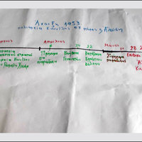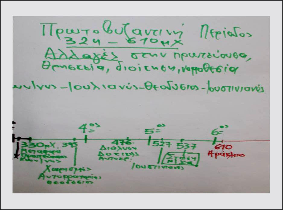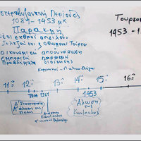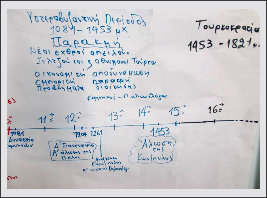 Ολοκληρώνοντας τη μελέτη των ιστορικών πηγών μέσα στις ομάδες, οι μαθητές επεξεργάστηκαν τις πληροφορίες που συνέλεξαν από τις πηγές, τις κατέγραψαν στο φύλλο εργασίας και η κάθε ομάδα ανάρτησε το φύλλο εργασίας της στην ιστοριογραμμή ώστε να συνθέσουν το χρονικό της Άλωσης, προκειμένου να αφηγηθούν το ιστορικό γεγονός χωρίς να χρειαστεί να ανατρέξουν στο βιβλίο της Ιστορίας.