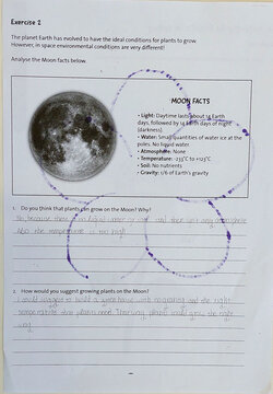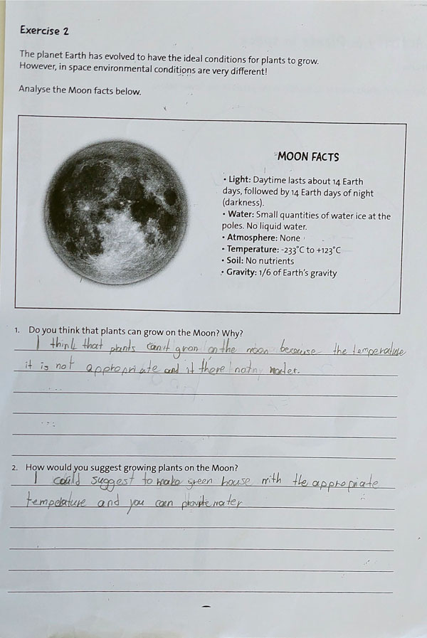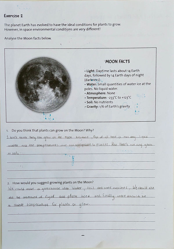 Στη δεύτερη άσκηση, οι μαθητές κλήθηκαν να εξετάσουν στοιχεία σχετικά με τη Σελήνη, όπως την απουσία ατμόσφαιρας, την ακαταλληλότητα του εδάφους για καλλιέργεια, την έλλειψη νερού και την ακραία θερμοκρασία. Με βάση αυτά τα δεδομένα, οι μαθητές/τριες απάντησαν σε δύο ερωτήσεις: αν πιστεύουν ότι τα φυτά μπορούν να αναπτυχθούν στη Σελήνη, καθώς και να προτείνουν τρόπους για την καλλιέργεια φυτών σε ένα τόσο αντίξοο περιβάλλον.