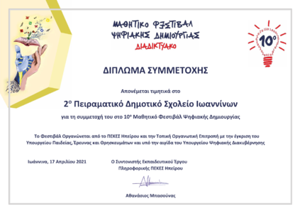 Οι μαθητές της Δ' τάξης (Σχ. Έτος 2020-2021) στο μάθημα της Πληροφορικής, εξοικειώθηκαν με το προγράμματα παρουσιάσεων Libre Office Impress και παρουσιάζουν τα έργα τους στο 10ο Μαθητικό Φεστιβάλ Ψηφιακής Δημιουργίας, που θα πραγματοποιηθεί στα Ιωάννινα στις 15-16 Απριλίου 2021. Μπορείτε να δείτε το πρόγραμμα εδώ.