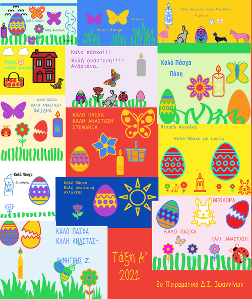 Οι μαθητές της Α' τάξης (Σχ. Έτος 2020-2021), δημιούργησαν κάρτες με ευχές για το Πάσχα, χρησιμοποιώντας την online εφαρμογή σχεδίασης Google AutoDraw, η οποία χρησιμοποιεί τεχνητή νοημοσύνη ώστε να μαντέψει τι είναι αυτό που θέλουμε να σχεδιάσουμε και αντιπαραβάλει το σχεδιό μας με δεκάδες σκίτσα που προσομοιάζουν σε αυτό.