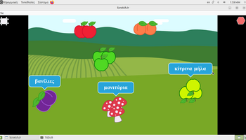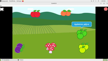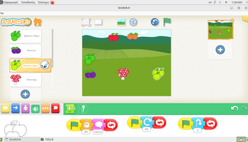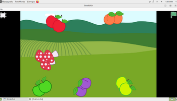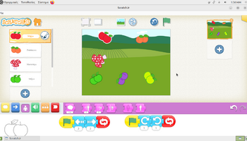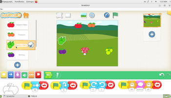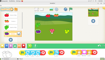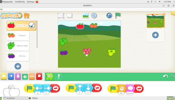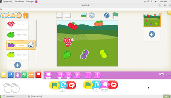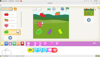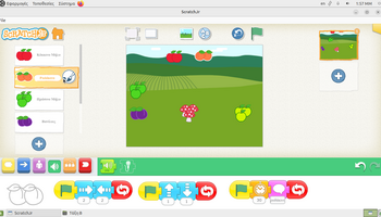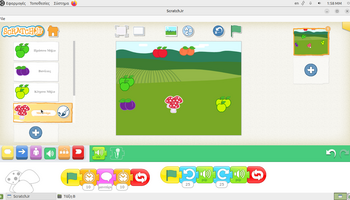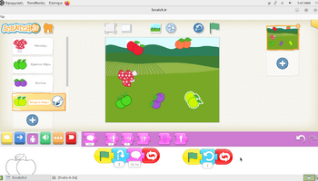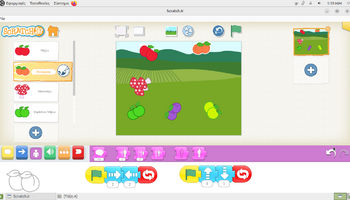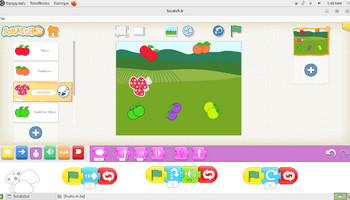 Αρχικά, στο περιβάλλον ζωγραφικής του ScratchJr, τα παιδιά πειραματίστηκαν με τα εργαλεία σχεδίασης και χρωματισμού, διπλασιάζοντας υπάρχοντα φρούτα και μεταβάλλοντας τα χρώματά τους. Με αυτόν τον τρόπο, από ένα κόκκινο μήλο δημιούργησαν ένα πράσινο και ένα κίτρινο μήλο, ενώ από το ροδάκινο κατασκεύασαν μια βανίλια, βάφοντάς τη με μωβ αποχρώσεις. Η διαδικασία αυτή συνέβαλε στην ανάπτυξη της οπτικής αντίληψης, της λεπτής κινητικότητας και της κατανόησης ότι οι ψηφιακές μορφές μπορούν να τροποποιούνται και να επαναχρησιμοποιούνται δημιουργικά. Στη συνέχεια, οι μαθητές/τριες προγραμμάτισαν τα φρούτα να εκτελούν χορευτικές κινήσεις, αξιοποιώντας την μπλε παλέτα εντολών για την κίνηση. Τα φρούτα κινούνται δεξιά και αριστερά, κάνουν στροφές και άλματα, ενώ οι κινήσεις τους επαναλαμβάνονταν συνεχώς, ενσωματώνοντας με βιωματικό τρόπο την έννοια της επανάληψης «για πάντα». Παράλληλα, ενσωματώθηκαν εντολές εμφάνισης λόγου, δίνοντας τη δυνατότητα στα φρούτα να εμφανίζουν το όνομά τους στην οθόνη, γεγονός που ενίσχυσε τη σύνδεση εικόνας, κειμένου και δράσης και την κατανόηση ότι οι ψηφιακές μορφές μπορούν να επικοινωνούν με τον χρήστη και να αλληλεπιδρούν με το περιβάλλον εκτέλεσης.