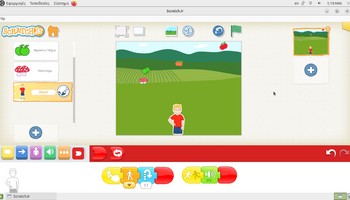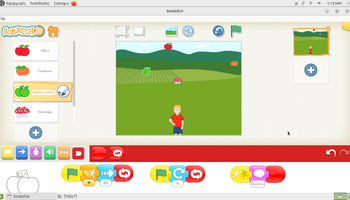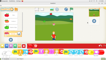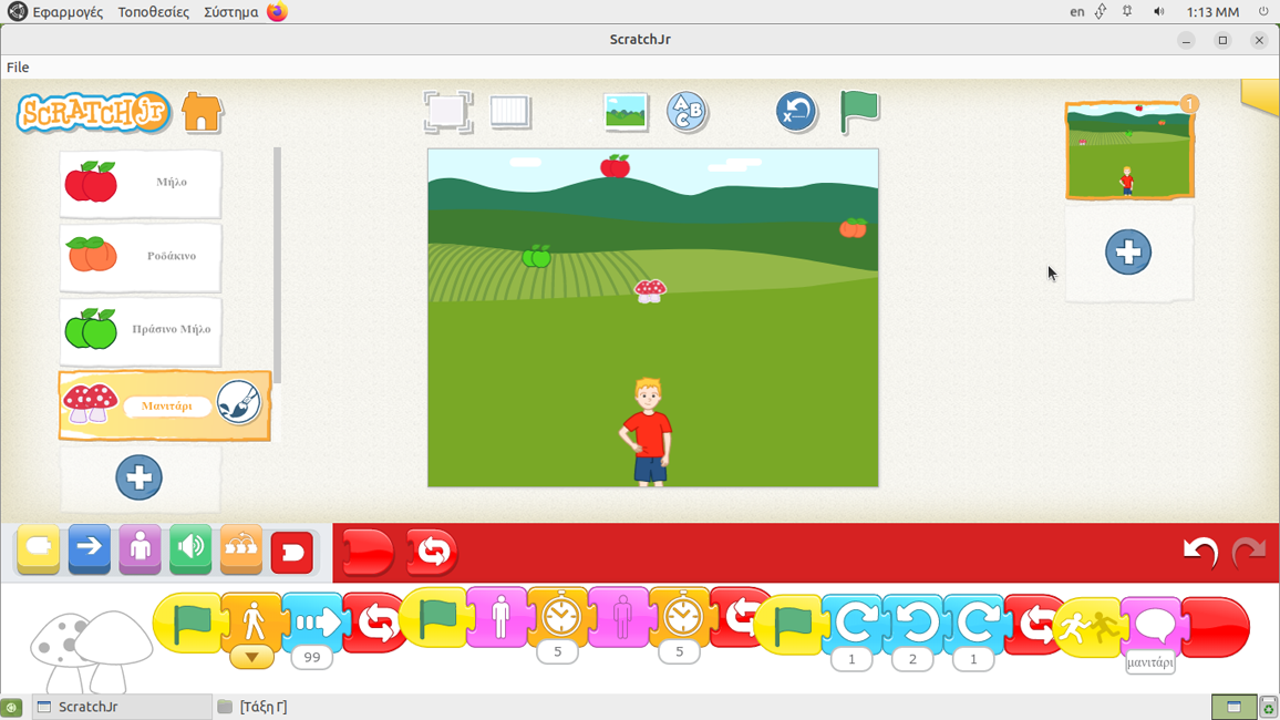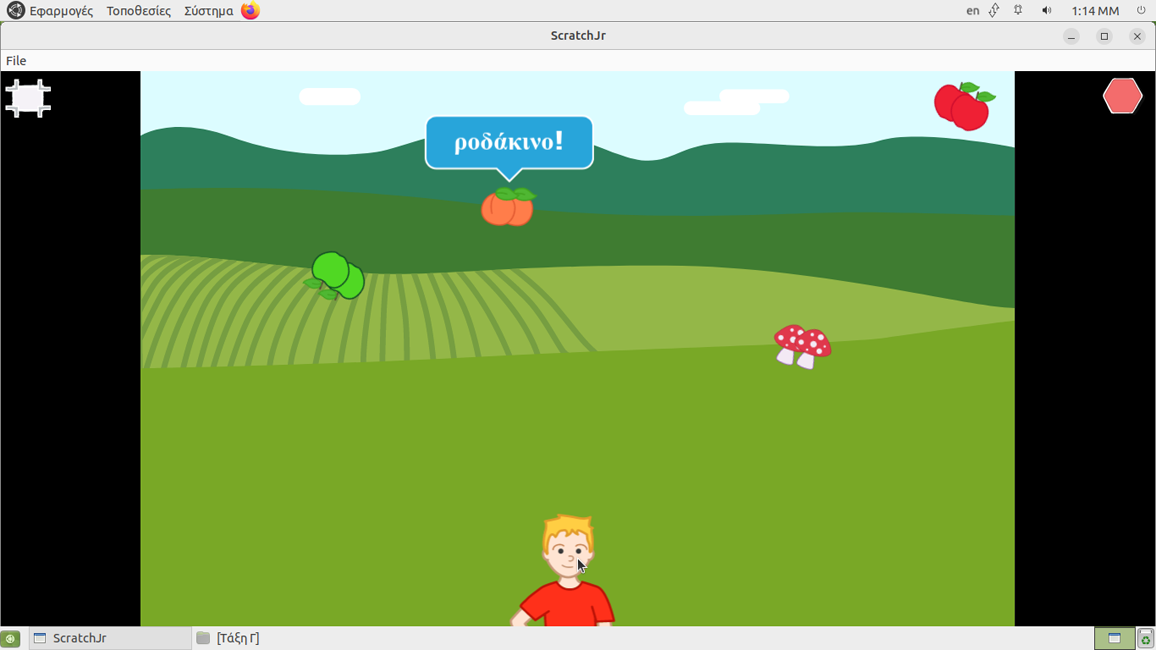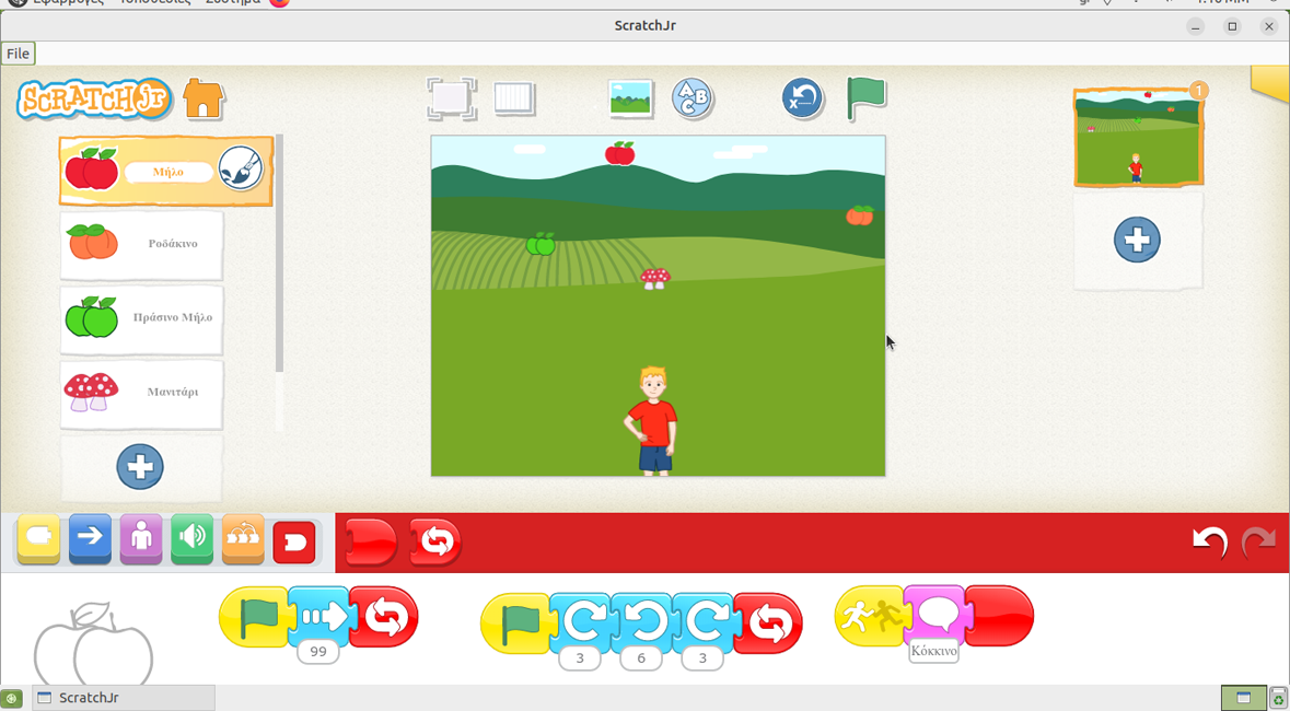 Αρχικά, στο περιβάλλον ζωγραφικής του ScratchJr, οι μαθητές/τριες πειραματίστηκαν με τα εργαλεία σχεδίασης και χρωματισμού, διπλασιάζοντας υπάρχοντα φρούτα και μεταβάλλοντας τα χαρακτηριστικά τους. Με αυτόν τον τρόπο, από ένα κόκκινο μήλο δημιούργησαν ένα πράσινο μήλο, ενώ από το ροδάκινο κατασκεύασαν μια «βανίλια», αξιοποιώντας μωβ αποχρώσεις. Στη συνέχεια, προγραμμάτισαν τα φρούτα να κινούνται και να εκτελούν χορευτικές κινήσεις, αξιοποιώντας την μπλε παλέτα εντολών για την κίνηση. Τα φρούτα κινούνται δεξιά ή αριστερά, πραγματοποιούν στροφές και άλματα, ενώ οι κινήσεις τους επαναλαμβάνονται συνεχώς, επιτρέποντας στα παιδιά να κατανοήσουν βιωματικά την έννοια της επανάληψης «για πάντα» και τη λογική ακολουθία εντολών. Επιπλέον, στο παιχνίδι ενσωματώθηκε ένας χαρακτήρας, αγοράκι ή κοριτσάκι, ο οποίος με το κλικ του ποντικιού πραγματοποιεί άλμα για να πιάσει τα φρούτα. Όταν ο χαρακτήρας ακουμπά ένα φρούτο, ακούγεται ένας χαρακτηριστικός ήχος και εμφανίζεται το όνομά του, ενισχύοντας την πολυαισθητηριακή εμπειρία. Με τον τρόπο αυτό, οι μαθητές/τριες κατανόησαν βασικές έννοιες γεγονότων και αλληλεπίδρασης, ενώ παράλληλα ενισχύθηκε το ενδιαφέρον και η ενεργή συμμετοχή τους.