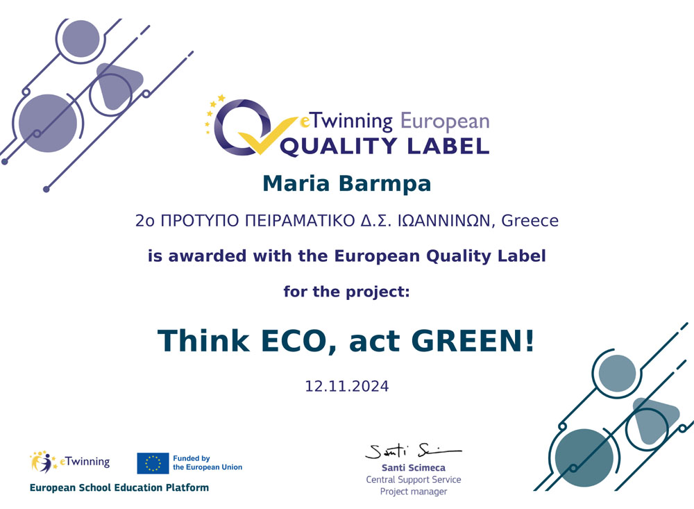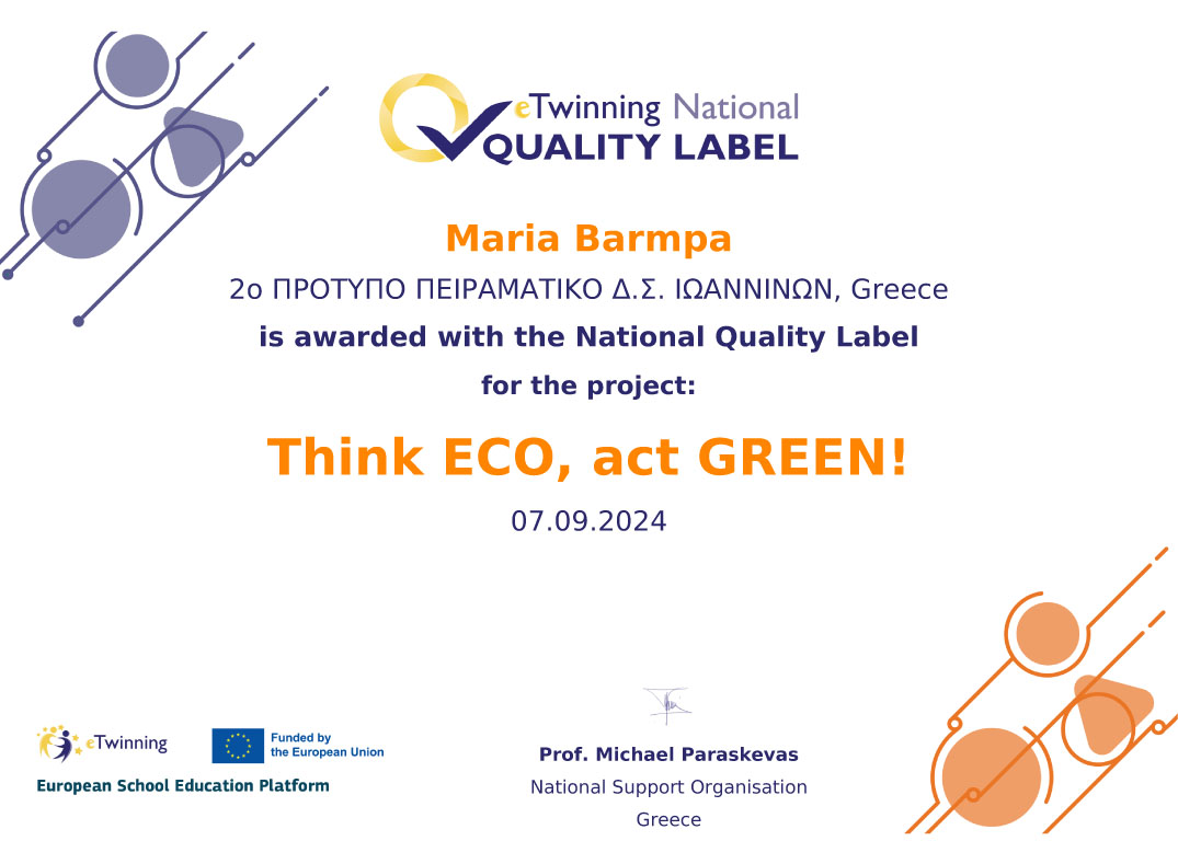 Το eTwinning έργο Think ECO, act GREEN! που πραγματοποιήθηκε στο Σχολείο μας κατά το σχ. έτος 2023-2024, βραβεύτηκε με την Εθνική και Ευρωπαϊκή Ετικέτα Ποιότητας. Το National Quality Label αποτελεί την εθνική αναγνώριση ενός έργου στο eTwinning. Η απονομή αυτού του τίτλου υποδεικνύει ότι το έργο έχει επιτύχει υψηλά πρότυπα ποιότητας και έχει συνεισφέρει σημαντικά στην εκπαιδευτική κοινότητα σε εθνικό επίπεδο. Στα κριτήρια περιλαμβάνονται η συνεργασία, η διαπολιτισμική κατανόηση, η καινοτομία και η πολιτιστική επίδραση στον τοπικό πληθυσμό. Το European Quality Label αντιπροσωπεύει την αναγνώριση ενός έργου σε ευρωπαϊκό επίπεδο, προβάλλοντας την εξαιρετική ποιότητα και την πρωτοποριακή φύση του. Η απονομή του σημαίνει ότι το έργο έχει ξεχωρίσει σε διακρατικό επίπεδο, προσφέροντας στην εκπαιδευτική κοινότητα της Ευρώπης προηγμένες πρακτικές και ανταλλάσσοντας ιδέες και εμπειρίες με σχολεία από διάφορες χώρες. Τα κριτήρια αξιολόγησης περιλαμβάνουν τη συνεργασία, την καινοτομία, την αειφορία και την ευρωπαϊκή διάσταση του έργου.