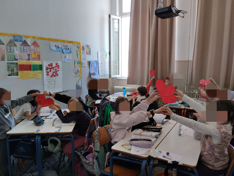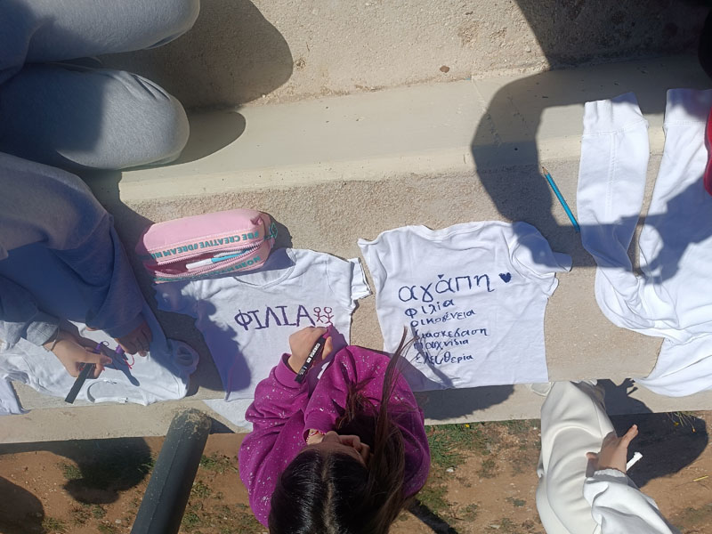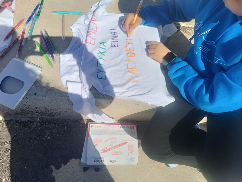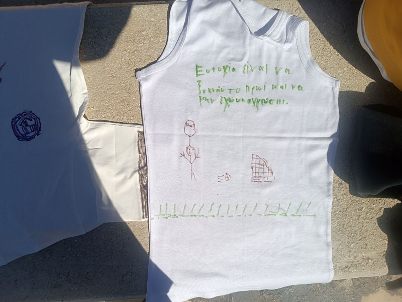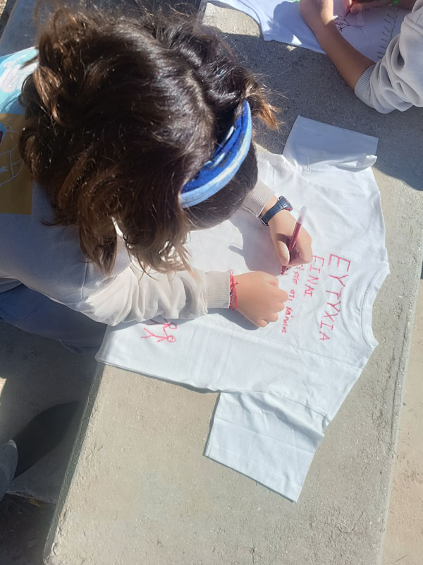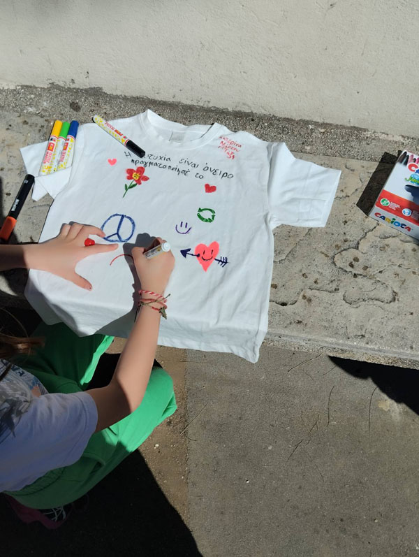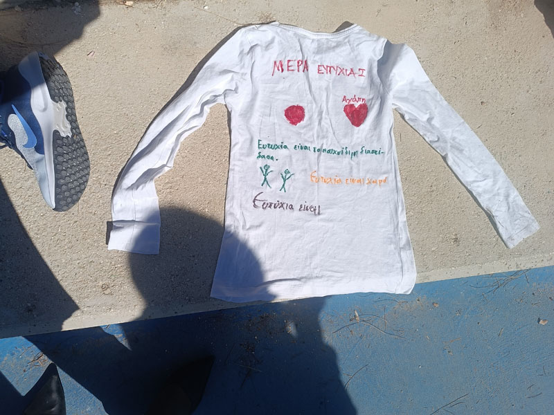 Η ημέρα ξεκίνησε με την παρακολούθηση του παραμυθιού "Εσύ γέμισες ένα κουβαδάκι σήμερα;", το οποίο μετέφερε στους μαθητές ένα βαθύ και συμβολικό μήνυμα σχετικά με τη συναισθηματική μας κατάσταση και τον τρόπο που επηρεάζουμε τους γύρω μας. Στη συνέχεια, οι μαθητές/τριες αναζήτησαν ποιήματα που υμνούν την ευτυχία και δημιούργησαν τα δικά τους, εκφράζοντας προσωπικές σκέψεις και συναισθήματα. Η αυλή του σχολείου γέμισε χρώμα και θετικά μηνύματα με τη "μπουγάδα της ευτυχίας", όπου οι μαθητές/τριες ζωγράφισαν πάνω σε μπλουζάκια φράσεις και εικόνες που συμβόλιζαν τη χαρά και τη συνεργασία. Οι τάξεις συνεργάστηκαν μεταξύ τους, δείχνοντας πως η ευτυχία είναι κάτι που χτίζεται συλλογικά.