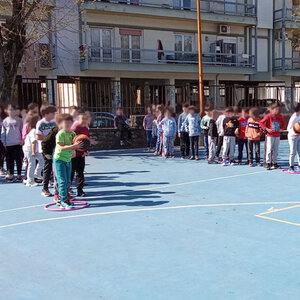 Οι ομάδες σχηματίστηκαν με τέτοιο τρόπο ώστε τα παιδιά να βρίσκονται ηλικιακά κοντά, γεγονός που διευκόλυνε την επικοινωνία και τη συμμετοχή όλων. Οι μικρότεροι μαθητές/τριες, των Α’ και Β’ τάξεων, συμμετείχαν με ενθουσιασμό σε παιχνίδια που ενίσχυσαν τη φαντασία και την κινητική τους δεξιότητα. Στο παιχνίδι «Επιχείρηση μεταφοράς ψαριών από τη μία λιμνούλα στην άλλη», τα παιδιά έπρεπε να συνεργαστούν για να μεταφέρουν μικρά αντικείμενα σε άλλη θέση, ενώ στη δοκιμασία «Βρες τον στόχο και κέρδισε», έπρεπε να συγκεντρωθούν και να πετύχουν με ακρίβεια συγκεκριμένους στόχους. Αντίστοιχα, οι μαθητές των Γ’ και Δ’ τάξεων συμμετείχαν σε δραστηριότητες που απαιτούσαν περισσότερη ομαδική συντονισμένη προσπάθεια και φυσική δεξιοτεχνία. Στο παιχνίδι «Πέρασε μέσα από το στεφάνι χωρίς να σπάσει η αλυσίδα», τα παιδιά έπρεπε να περάσουν το στεφάνι από τον έναν στον άλλον χωρίς να διακόψουν την αλυσίδα των χεριών, καλλιεργώντας την ομαδικότητα και την υπομονή. Στο «Τρίπλαρε όσο πιο γρήγορα μπορείς», κάθε παιδί ανέλαβε μια διαδρομή, όπου έπρεπε να τρίπλαρει μπάλα με ταχύτητα και ακρίβεια, ενισχύοντας τον συντονισμό και την επιμονή του.