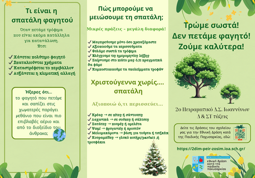 Τη Δευτέρα 22 Δεκεμβρίου 2025, οι μαθητές και οι μαθήτριες των Δ' και ΣΤ' τάξεων του Σχολείου μας τραγούδησαν τα κάλαντα της υγιεινής διατροφής και μοίρασαν ενημερωτικά φυλλάδια για την υγιεινή διατροφή και τη σπατάλη τροφίμων στον πεζόδρομο Μιχαήλ Αγγέλου. Σκοπός της δράσης ήταν η ευαισθητοποίηση και η ενημέρωση του κοινού σχετικά με τη σημασία της ισορροπημένης διατροφής και της μείωσης της σπατάλης τροφίμων, ιδιαίτερα κατά την εορταστική περίοδο. Μέσα από τα τραγούδια και το ενημερωτικό υλικό, τα παιδιά μετέφεραν μηνύματα για την αξία της σωστής διατροφής, της υπεύθυνης κατανάλωσης και του σεβασμού προς το περιβάλλον.