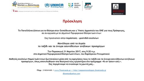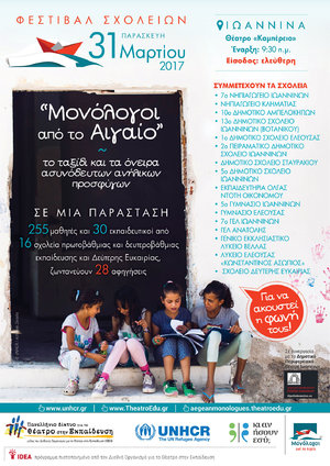 Την Παρασκευή 31 Μαρτίου 2017, στις 9:20 π.μ., το Σχολείο μας και άλλα 15 σχολεία συμμετέχουν στην παράσταση - φεστιβάλ σχολείων «Μονόλογοι από το Αιγαίο»: το ταξίδι και τα όνειρα ασυνόδευτων ανήλικων προσφύγων. 255 μαθητές με αφορμή τα κείμενα του βιβλίου «Μονόλογοι από το Αιγαίο» ζωντανεύουν σκέψεις, αναμνήσεις, συναισθήματα και όνειρα ασυνόδευτων ανήλικων προσφύγων, που πέρασαν το Αιγαίο με την ελπίδα να ζήσουν σε έναν κόσμο που μας αγκαλιάζει όλους.