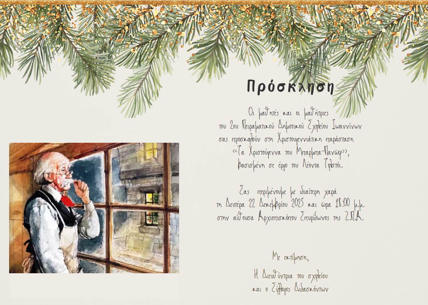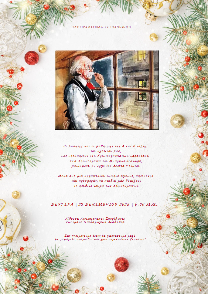 Τη Δευτέρα 22 Δεκεμβρίου 2025 το απόγευμα, πραγματοποιήθηκε με ιδιαίτερη επιτυχία η χριστουγεννιάτικη γιορτή του σχολείου μας στην αίθουσα Αρχιεπισκόπου Σπυρίδωνος της Ζωσιμαίας Παιδαγωγικής Ακαδημίας. Πρωταγωνιστές της εκδήλωσης ήταν οι μαθητές και οι μαθήτριες της Α΄ και Β΄ τάξης, οι οποίοι παρουσίασαν το θεατρικό έργο «Τα Χριστούγεννα του Μπαρμπα-Πανώφ», μια τρυφερή και βαθιά συγκινητική ιστορία βασισμένη σε διήγημα του Λέοντα Τολστόι.